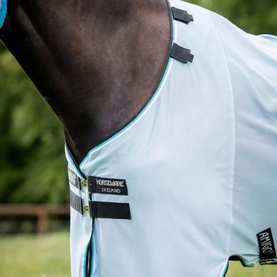 Zilverkleurige vliegendeken van zacht aanvoelend, fijnmazig en zonreflecterend polyester. Het halsstuk is afneembaar en de lange staartflap beschermd uw paard prima tegen insecten. Deken is voorzien van het Horseware linersysteem.Â
