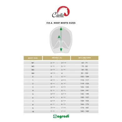 F.R.A.® Cavallo … de méést simpele hoefschoen ter wereld! Kenmerken: één simpele, meervoudige klittebandsluiting aan de voorzijde / de schoen laat zich daardoor in één beweging aan- en afdoen / de schoen is daardoor zeer stevig aan de hoef verbonden / gevormd naar de anatomie van de onbeslagen natuurlijke hoef / een verhoogde binnenrand draagt de onderrand van de hoef en maakt de zool vrij van druk / de anatomisch voorgevormde achterzijde beschermt de hoefballen / de echt lederen opbouw is zacht en komfortabel / de opbouw is aan de bovenzijde afgewerkt met een schuimgevulde zacht lederen kraag . De hoefschoen is opgebouwd uit duurzame materialen: 1e kwaliteit leder,waterproof stiksel, roestvrijstalen klitteband geleiders,de zool zelf is vervaardigd uit het kwalitatief zeer hoogwaardige materiaal thermo plastic urethane (TPU). Ingebouwde drainage sleuven voorkomen het vastzuigen in modderige plaatsen, de hoefschoen is licht van gewicht en schokabsorberend. Tevens bevordert de hoefschoen de groei van gezonde hoeven: het ongestoord funktioneren van het hoefmechanisme heeft een optimale bloedcirculatie tot gevolg. De schoen is wereldwijd gepatenteerd onder nummer US 553,806S.Verkrijgbaar in 7 maten, handig te bepalen aan de hand van de beschikbaar gestelde maattabel.Â