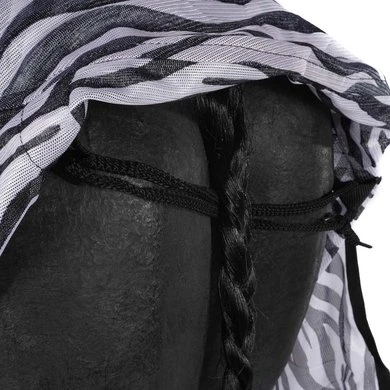 De HKM vliegendeken Zebra is extreem winddoorlatend en duurzaam. De deken is voorzien van metalen borstsluiting, dubbele borstsluiting, buikflap, staartriem, staartflap en extra lange zijkanten. De stof is van hoogwaardige kwaliteit, 100% polyester. De deken is onderhoudsvriendelijk. De zebraprint vermindert de hoeveelheid aanvliegende insecten. Wasmachinebestendig tot 30 graden, mag in de droogtrommel.