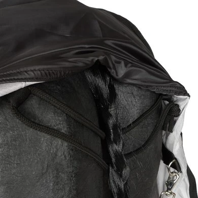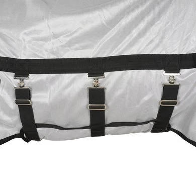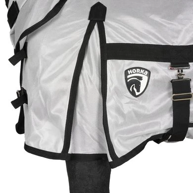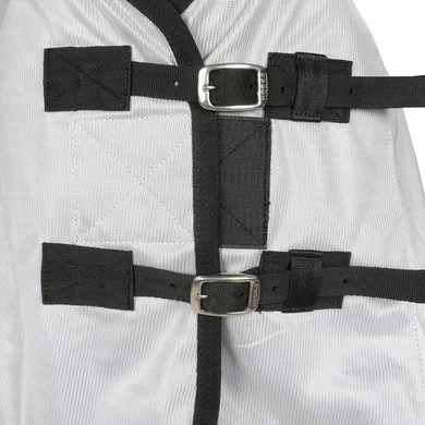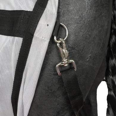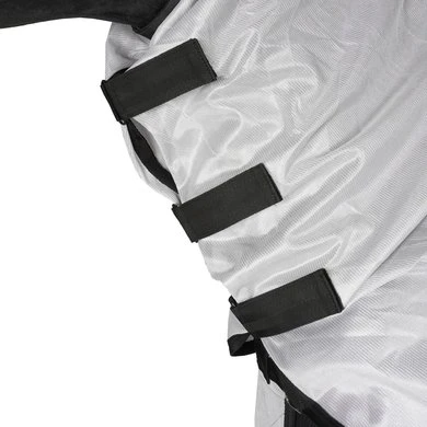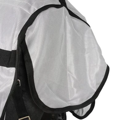 Anti vliegendeken met vaste hals, welke extra lang is zodat de hals ook bedekt blijft tijdens het grazen. De deken heeft een nylon voering op de borst, staartflap en hals om schuurplekken te voorkomen.