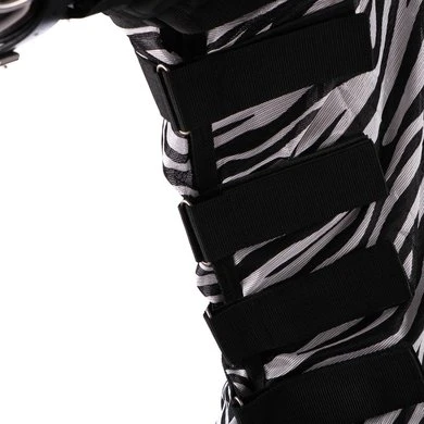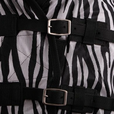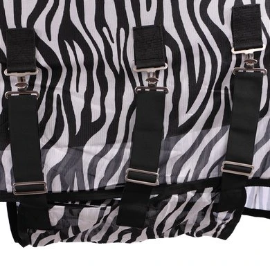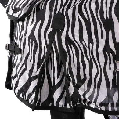 De Imperial Riding UV-vliegendeken met vaste hals en buikflap wordt geleverd met een losse hoofdkap. Gemaakt van mesh-stof met een zeer fijne maas (100% polyester) dat het paard beschermt het paard tegen vliegen en muggen én voorkomt dat het paard verkleurd door de zon. De binnenzijde is polyester met nylon voering bij de schouder en manen. De borstsluiting bestaat uit klittenband en een dubbele gespsluiting. De hals heeft vier klittenbandsluitingen en uitsparing voor de oren. Verder is de deken voorzien van een lange staartflap mét staartlus en elastische bilriemen. Het masker heeft een klittenbandsluiting en is afgewerkt met fleece. De verstelbare buikflap heeft drie rechte singels.
