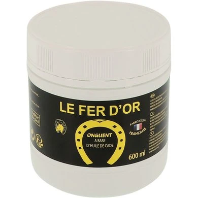 Op cade olie gebaseerd hoefvet. Complete hoefbescherming bij nat weer. Dit hoefvet is speciaal aanbevolen voor paarden die buiten staan tijdens nat weer. De teer die in de samenstellingwordt gebruikt, maakt de wand en de zool waterdicht, terwijl de cade olie rotstraal bestrijdt. Hoefsmeden gebruiken het tegen voetklachten, rotstraal, grind en laminitis. Instructies: We raden aan om “Le Fer d’Or” met een borstel op de hoeven (kroonrand, zool en sraal) te gebruiken. Op een koele plaats bewaren, goed mengen voor gebruik.