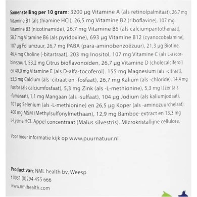 3200 µg Vitamine A (als retinolpalmitaat), 26,7 mg Vitamine B1 (als thiamine HCl), 26,5 mg Vitamine B2 (riboflavine), 107 mg Vitamine B3 (nicotinamide), 26,7 mg Vitamine B5 (als calciumpantothenaat), 58,7 mg Vitamine B6 (als pyridoxine), 693 µg Vitamine B12 (cyanocobalamine), 107 µg Foliumzuur, 26,7 mg PABA (para-aminobenzoezuur), 21,3 µg Biotine, 46,4 mg Choline (-bitartraat), 203 mg Inositol, 107 mg Vitamine C (als L-ascorbinezuur), 53,2 mg Citrus bioflavonoiden, 26,7 µg Vitamine D (cholecalciferol) en 40,0 mg Vitamine E (als D-alfa-tocoferol). 155 mg Magnesium (als -citraat), 53,3 mg Calcium (als citraat en -fosfaat), 26,7 mg Kalium (als -chloride), 14,4 mg Fosfor (als calciumfosfaat), 5,3 mg Zink (als -L-methionine), 5,3 mg IJzer (als -fumaraat), 1,1 mg Mangaan (als -sulfaat), 104 µg Jodium (als kaliumjodaat), 101 µg Selenium (als -L-methionine) en 26,5 µg Koper (als -aminozuurchelaat). 400 mg MSM (Methylsulfonylmethaan), 12,9 mg Bamboe-extract en 13,3 mg L-Lysine HCl. Appel concentraat (Malus silvestris). Microkristallijne cellulose.