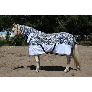 De Tempest Zebra Fly combo is de ideale vliegendeken met vaste hals. In navolging van het succes van het Shires Zebra-vliegenmasker, haalt deze mesh-vliegendeken inspiratie uit de natuur en streeft het samen met de beproefde ontwerptechnologie naar het meest effectieve afschrikmiddel tegen hinderlijke vliegen en bijtende insecten. De geïntegreerde nekbescherming vermijdt een naad bij de schoft voor meer comfort, en sluit met klittenband. Daarnaast heeft de deken een dubbele borstsluiting met gespen, verstelbare kruissingels, een bilkoord en een staartflap. Gevoerd op de borst en alle naden om wrijving te voorkomen. Let op: wordt geleverd zonder masker.