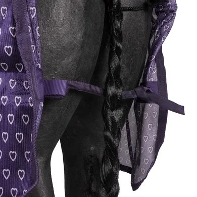Lichtgewicht vliegendeken met hartjesprint, dubbele sluiting aan de voorkant, gekruiste banden met elastiek en filetkoord. Komt overeen met alle artikelen in de Waldhausen Lucky Heart-serie.