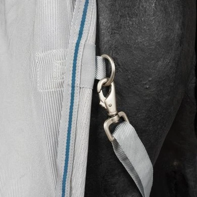 Hoge kwaliteit vliegendeken gemaakt van een fijnmazige stof. De buik- en staartflappen van de deken zorgen voor bescherming tegen vervelende insecten. De dubbele voorsluiting, schopplooi, filetkoord en beenriemen garanderen een perfecte pasvorm. Voor extra bescherming van de nek en manen van het paard adviseren wij het bijpassende nekdeel 44978527 .